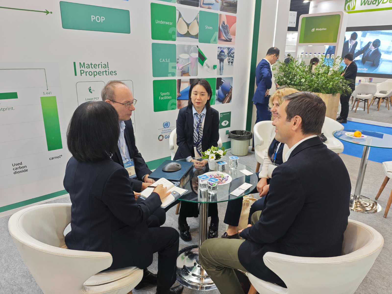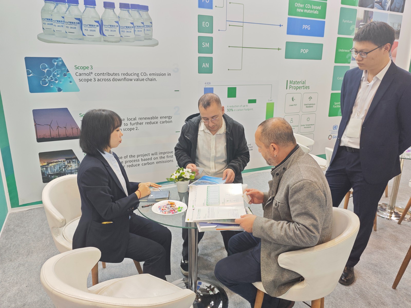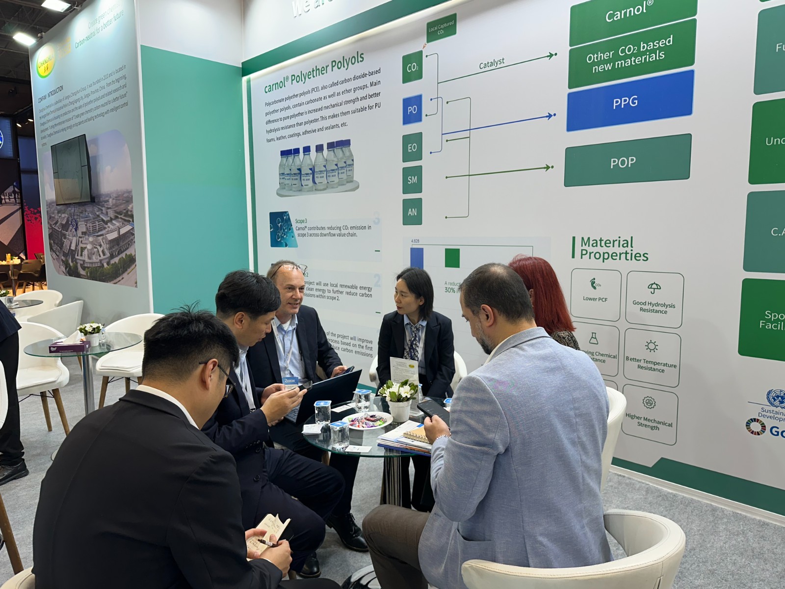 此次展会集中展示了长华化学在绿色创新材料领域的成果突破,尤其是carnol®系列聚醚,该款材料采用国际领先的催化剂技术,以捕集的工业排放二氧化碳为原料制备高分子新材料,兼具高性能和绿色环保特性,为汽车、家居等领域提供了绿色可持续的解决方案。